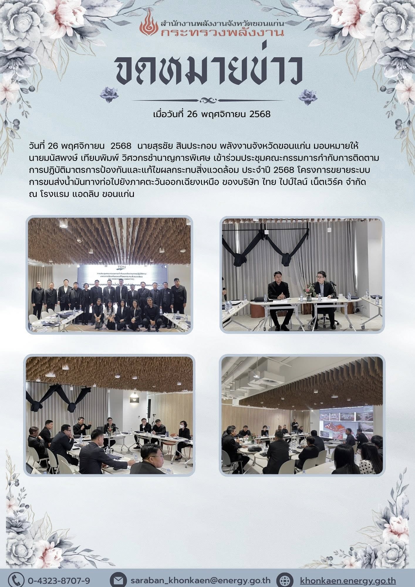 เข้าร่วมประชุมคณะกรรมการกำกับการติดตามการปฏิบัติมาตรการป้องกันและแก้ไขผลกระทบสิ่งแวดล้อม ประจำปี 2568 โครงการขยายระบบการขนส่งน้ำมันทางท่อไปยังภาคตะวันออกเฉียงเหนือ ของบริษัท ไทย ไปป์ไลน์ เน็ตเวิร์ค จำกัด