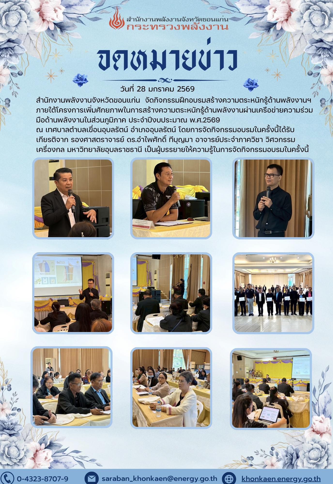 กิจกรรมฝึกอบรมสร้างความตระหนักรู้ด้านพลังงานฯ ภายใต้โครงการเพิ่มศักยภาพในการสร้างความตระหนักรู้ด้านพลังงานผ่านเครือข่ายความร่วมมือด้านพลังงานในส่วนภูมิภาค ประจำปีงบประมาณ พ.ศ.2569