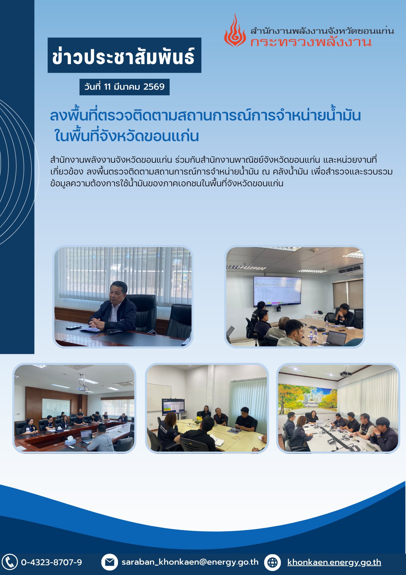 สำนักงานพลังงานจังหวัดขอนแก่น ร่วมกับ สำนักงานพาณิชย์จังหวัดขอนแก่น และหน่วยงานที่เกี่ยวข้อง ลงพื้นตรวจติดตามสถานการณ์การจำหน่ายน้ำมัน เพื่อสำรวจและรวบรวมข้อมูลความต้องการใช้น้ำมันของภาคเอกชนในพื้นที่จังหวัดขอนแก่น